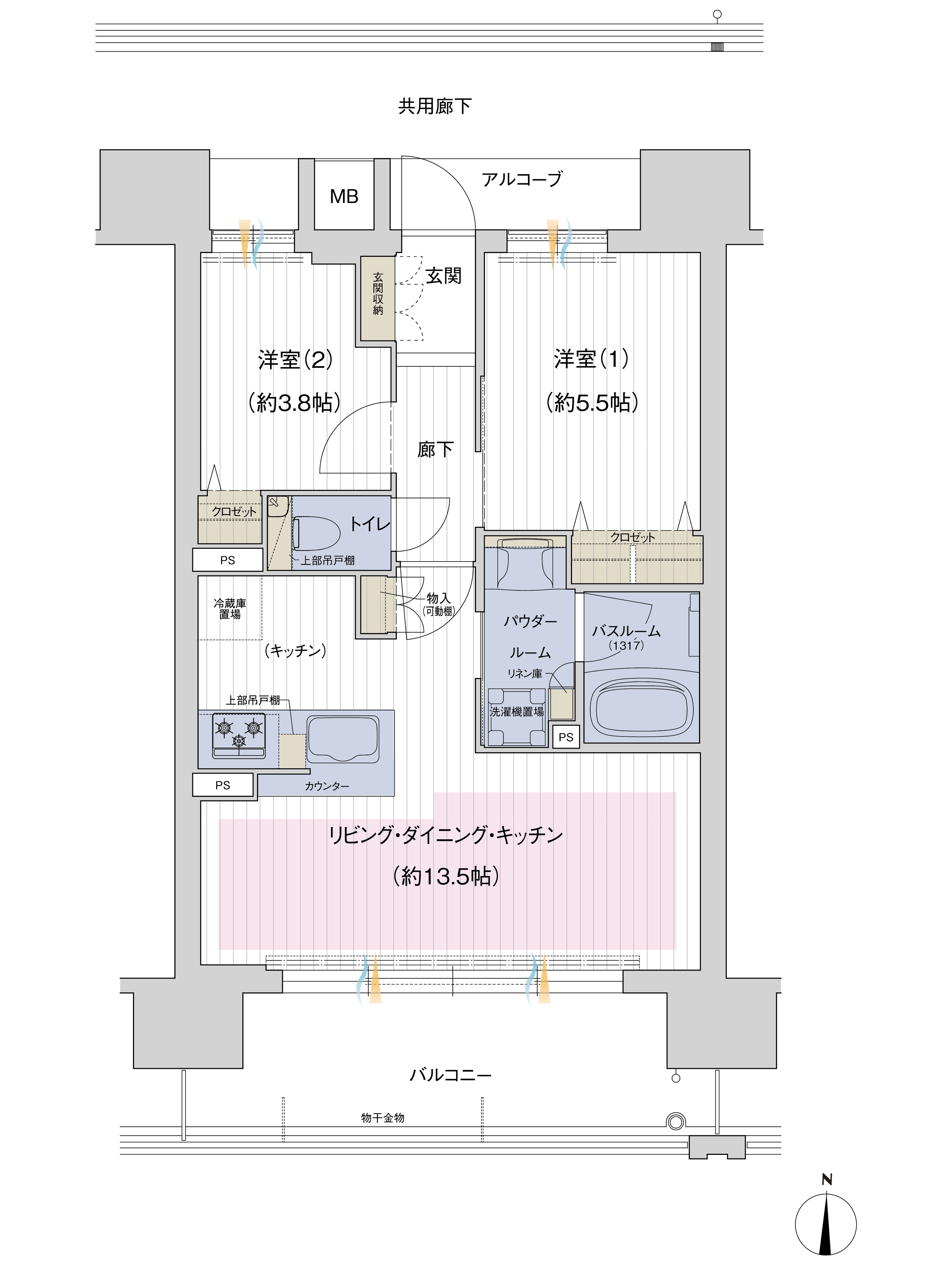 住居専有面積 51.08㎡(約15.45坪) バルコニー面積/10.80㎡(約3.26坪) アルコーブ面積/4.66㎡(約1.40坪)