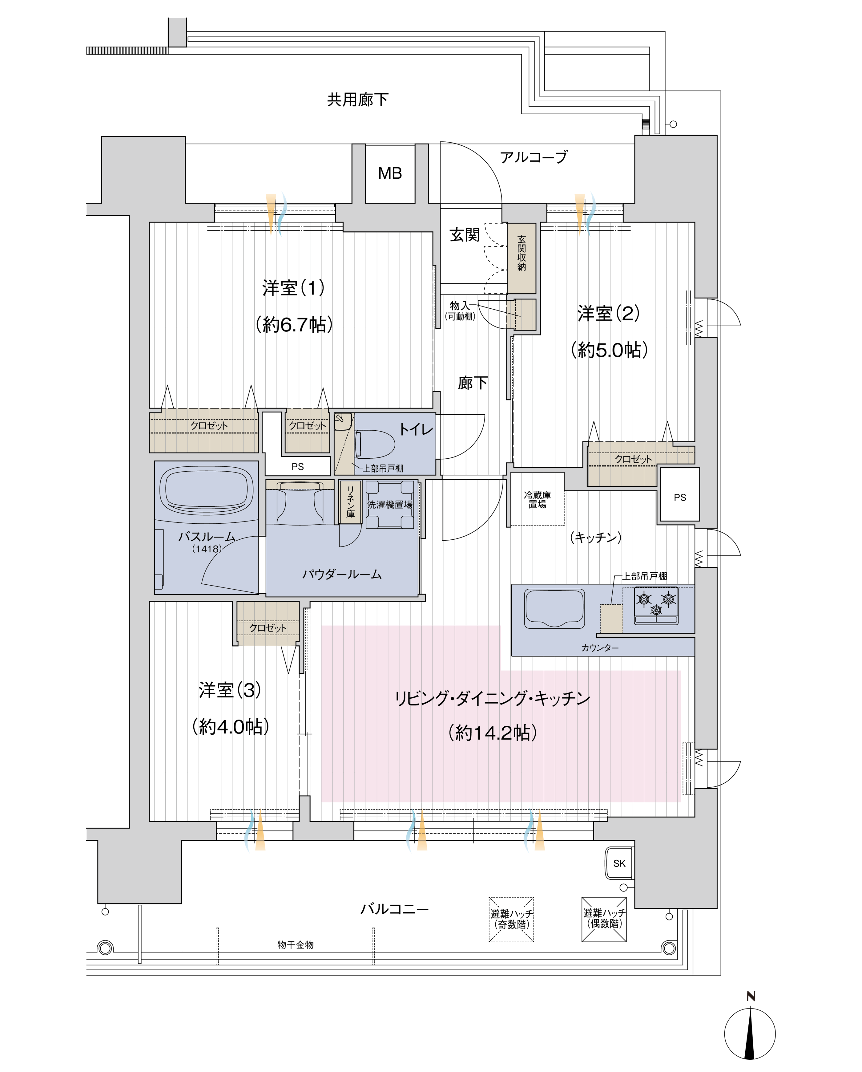 住居専有面積 65.36㎡(約19.77坪) バルコニー面積/13.23㎡(約4.00坪) アルコーブ面積/5.57㎡(約1.68坪)